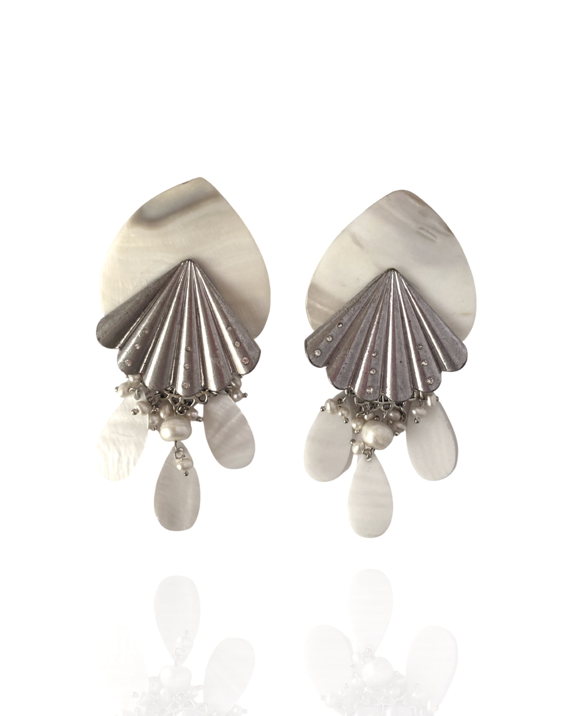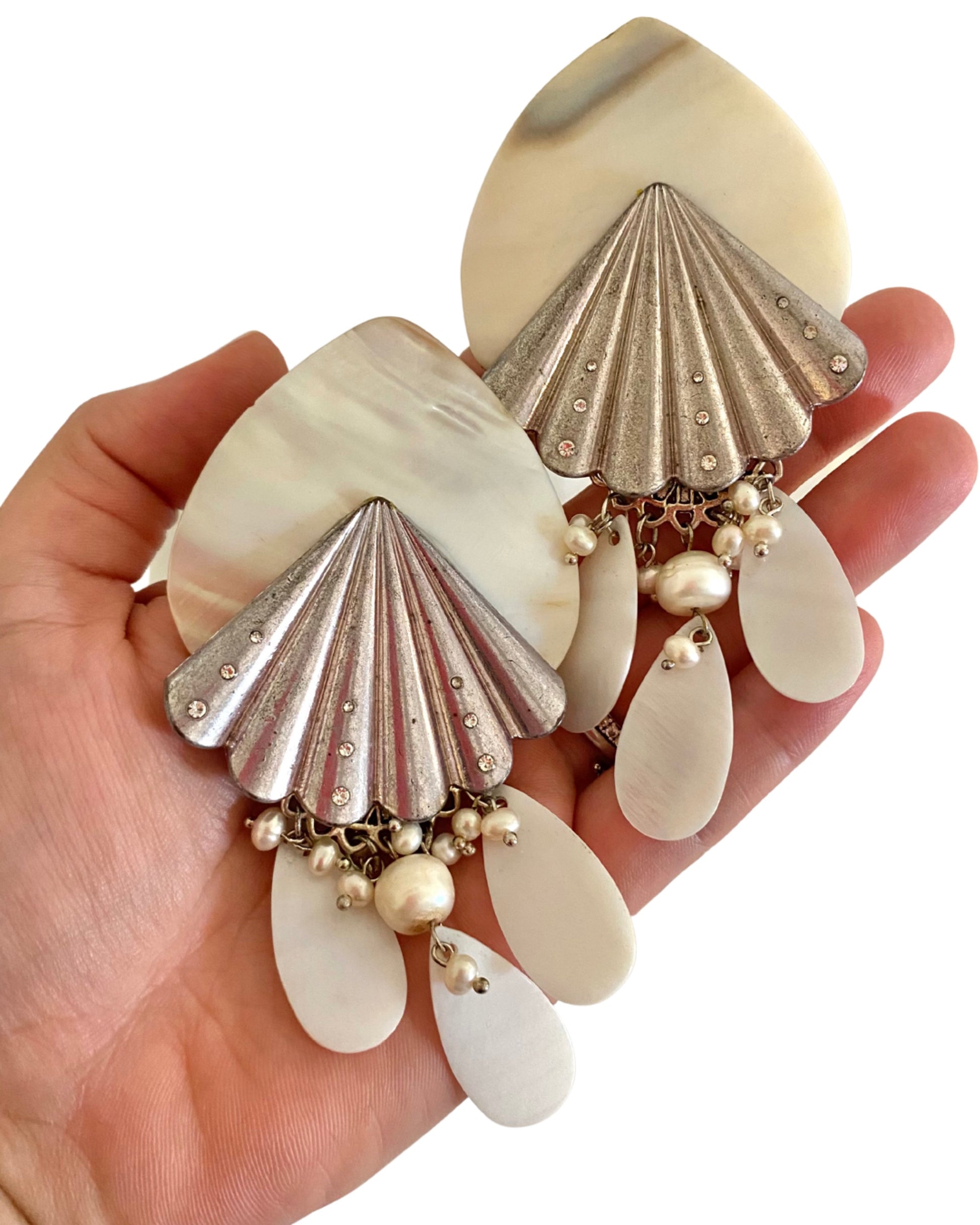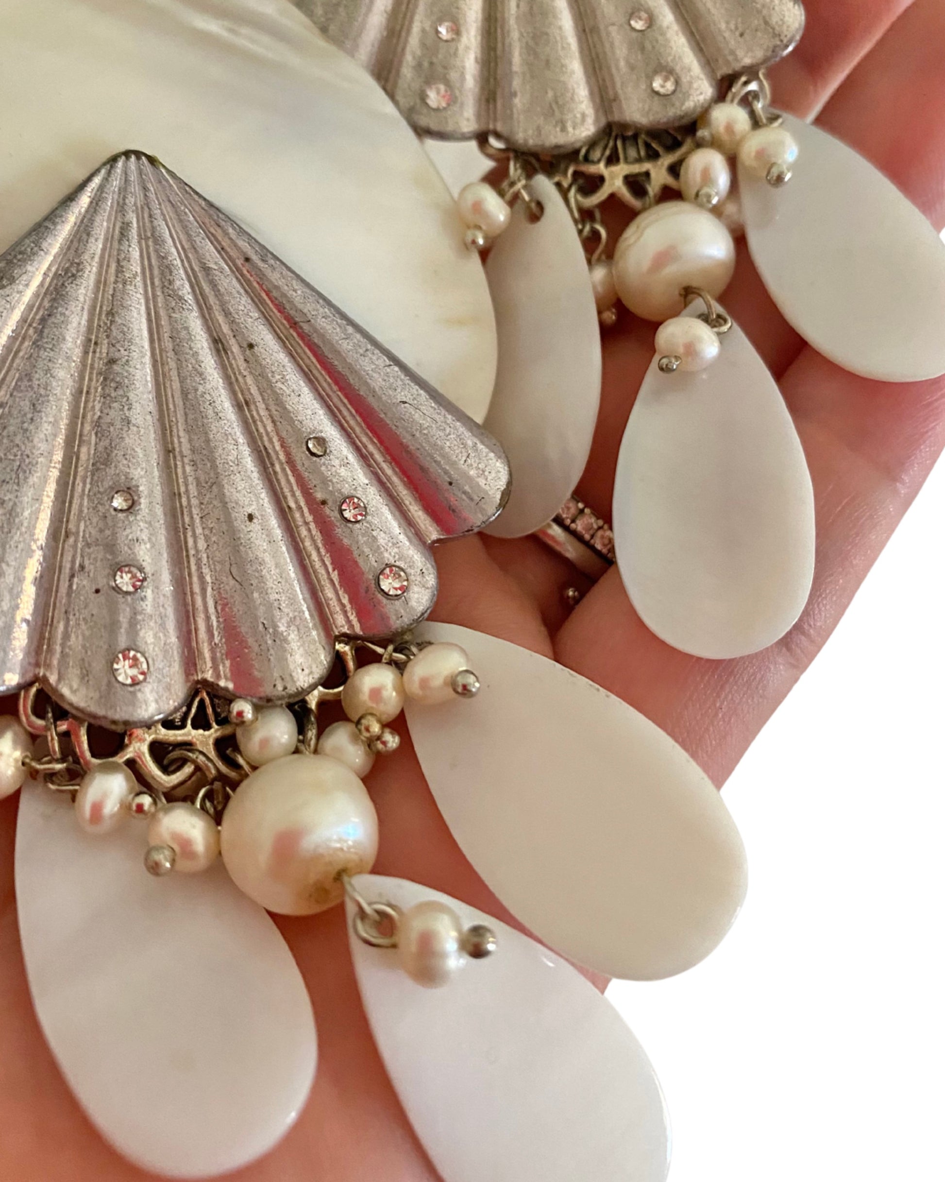 INVERTED SHELL HEART WITH PEWTER SHELL PIECE FIND AND RESTORED WITH FRESHWATER PEARLS AND MOTHER PEARL DANDLING